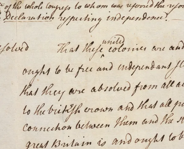 Por lo tanto, los Representantes de los Estados Unidos de América, convocados en Congreso General, apelando al Juez Supremo del mundo por la rectitud de nuestras intenciones, en nombre y por la autoridad del buen pueblo de estas Colonias, solemnemente hacemos público y declaramos: que estas Colonias Unidas son, y por derecho deben ser, Estados Libres e Independientes; que quedan libres de toda lealtad a la Corona Británica, y que toda vinculación política entre ellas y el Estado de la Gran Bretaña queda y debe quedar totalmente disuelta; y que, como Estados Libres o Independientes, tienen pleno poder para hacer la guerra, concertar la paz, concertar alianzas, establecer el comercio y efectuar los actos y providencias a que tienen derecho los Estados independientes.