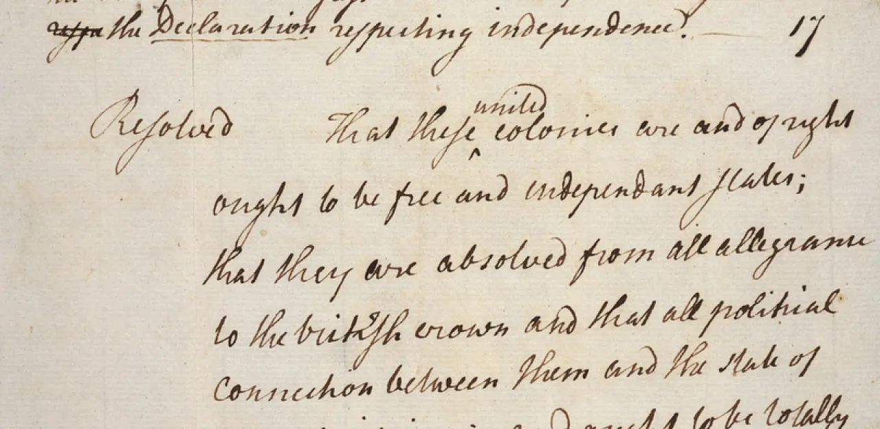 Resuelto, que estas Colonias Unidas son, y deben ser, Estados libres e independientes; que están absueltas de toda lealtad a la Corona británica, y que toda conexión política entre ellas y el Estado de Gran Bretaña está y debe estar totalmente disuelta. Que es oportuno tomar inmediatamente las medidas más eficaces para formar alianzas extranjeras. Que se prepare un plan de confederación y se envíe a las respectivas Colonias para su consideración y aprobación.