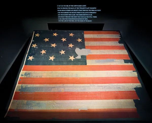 American Lawyer Francis Scott Key, held on a British warship for a prisoner negotiation during the frightening siege, feared that the fort had succumbed to the bombardment. But when he sees the large flag flying over the fort on the morning of September 14, he knows the fort held. The relief and awe he feels inspire him to write a poem, "Defense of Fort McHenry," which is later be set to the tune “To Anacreon in Heaven.” Renamed "The Star-Spangled Banner," the song officially becomes the national anthem of the United States in 1931.